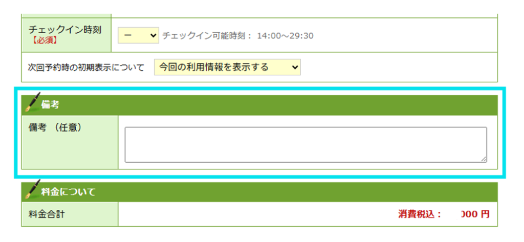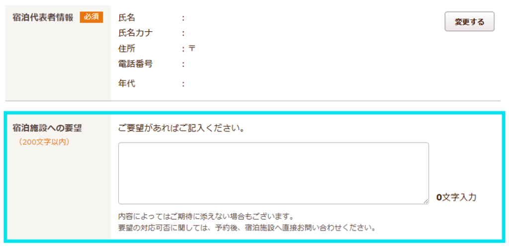 予約画面の「宿泊施設への要望」欄に記入できます。